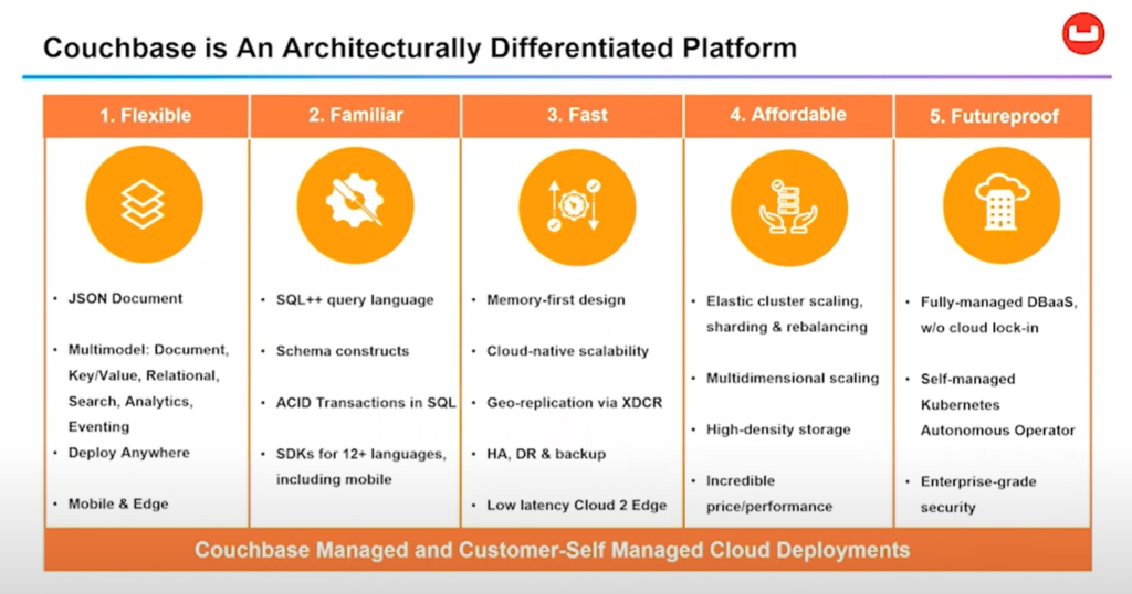 You can see that we matched our customers’ experiences into each of these questions, demonstrating that Couchbase helps them excel within their markets, resolve key issues they face with their legacy systems and drive down their costs of cloud operations. Of course, we appeal to IT organizations because Couchbase is fast, flexible and familiar to developers and IT alike.Â