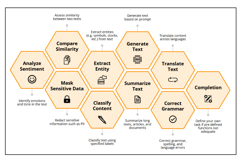 Embedding AI-driven analysis of text directly into your application workflows accelerates developer productivity. Our AI Functions work by using simple SQL++ statements and eliminate the need for external tooling and custom coding. You can perform transformations, execute complex analysis, and gain insights regarding LLM conversations using familiar query language constructs, right within the database.