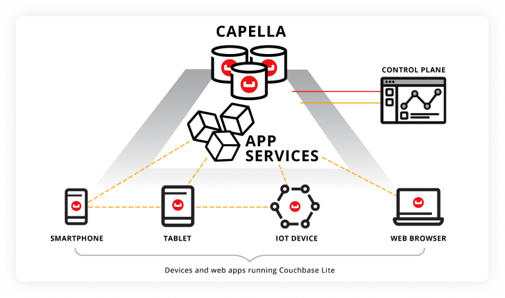 App Services is a hosted gateway for data sync between Capella and Couchbase Lite enabled apps running on mobile, desktop, IoT, or browser-based web apps. It supports SQL, full-text search, vector search, and a wide array of platforms, devices, and cloud environments.