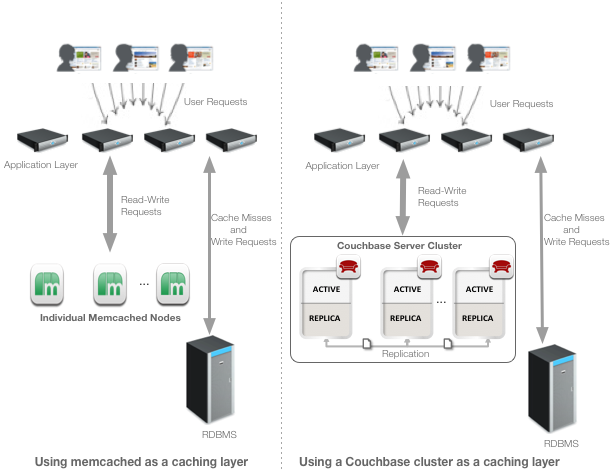 Compare Couchbase and Memcached to see how Couchbase adds persistence, replication, querying, and scalability beyond simple key-value caching.
